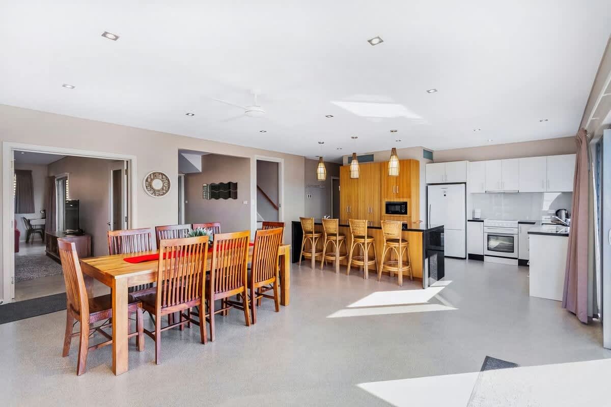 Fully equipped open plan kitchen with island bench/ breakfast bar with 4 seats and the room looks out toward the ocean. The kitchen has a microwave, electric oven and cooktop and cooking basics.