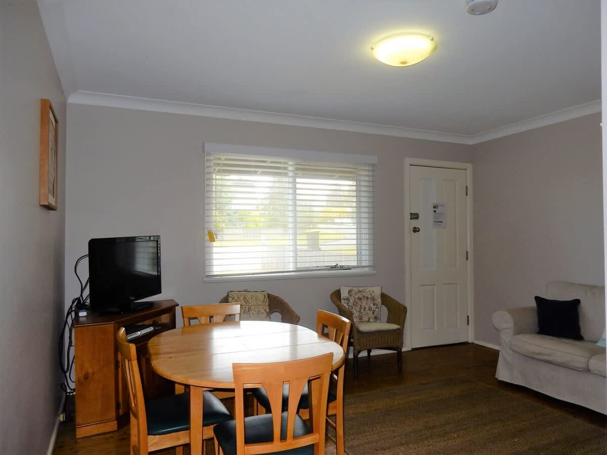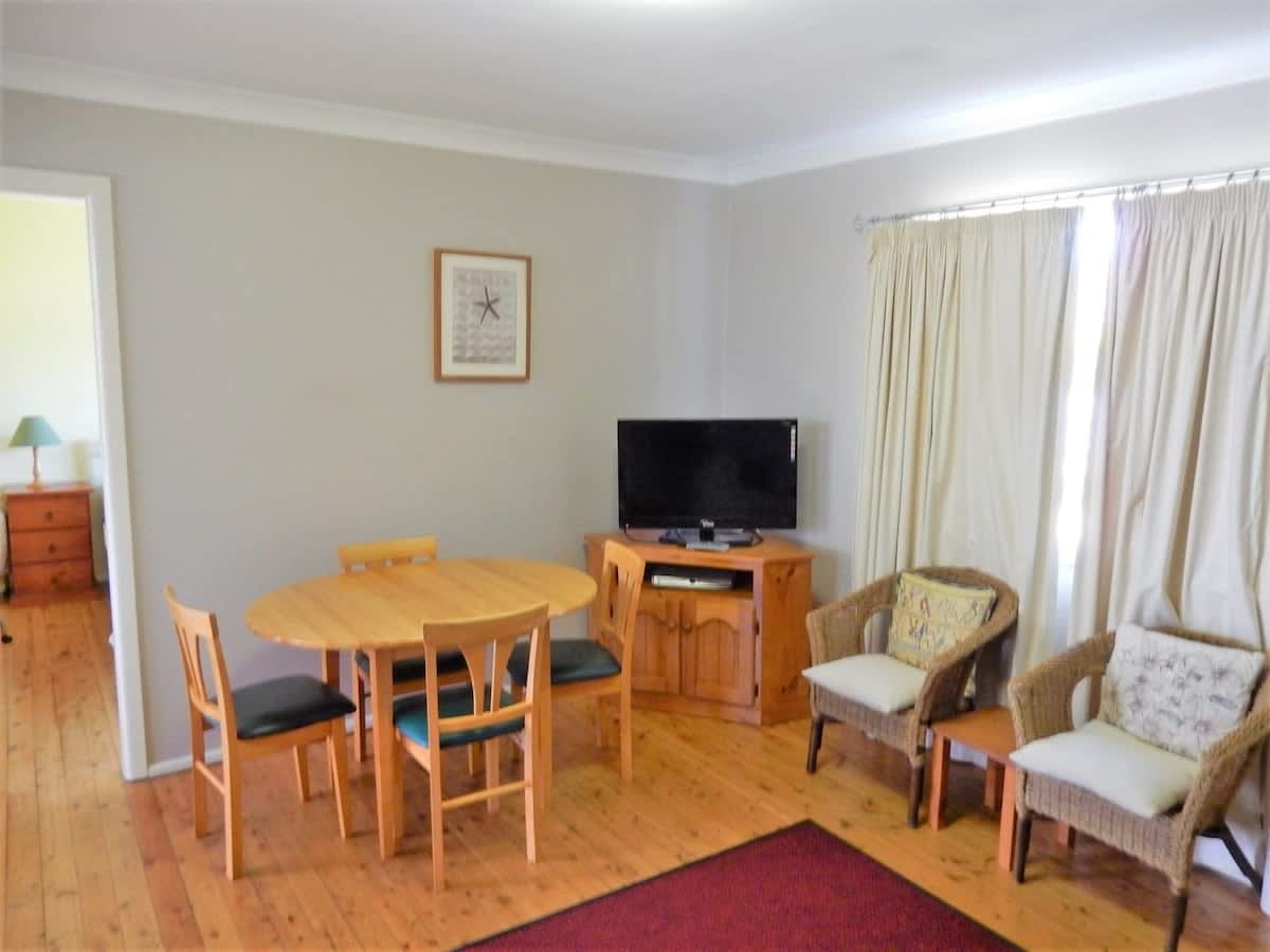 Enjoy the simplicity of this comfortable and cosy beach cottage. The combined lounge and dining has a couch, TV and a 4-seater dining table. The kitchen is well equipped with a fridge, oven, microwave, and coffee machine.