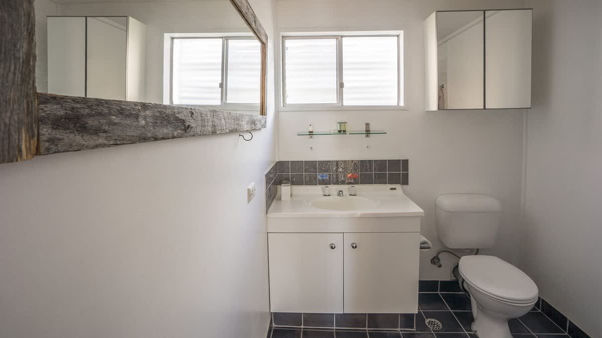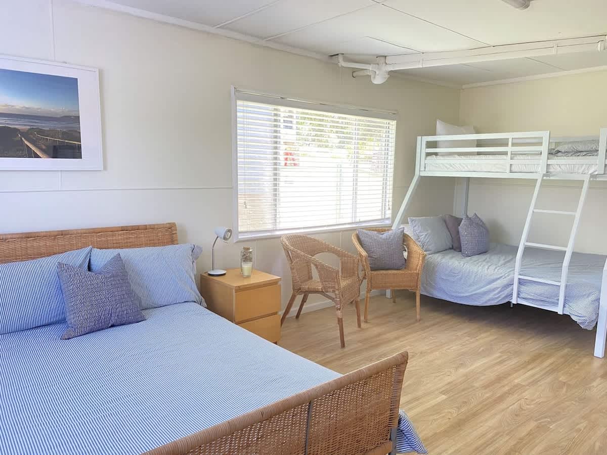The bedroom configuration comprises three rooms. The master suite is the epitome of comfort, featuring a queen bed and a ceiling fan for those hot summer days. The second bedroom has 2 single beds. The third bedroom is located downstairs and features 1 double bed and a tri bunk (single over double)